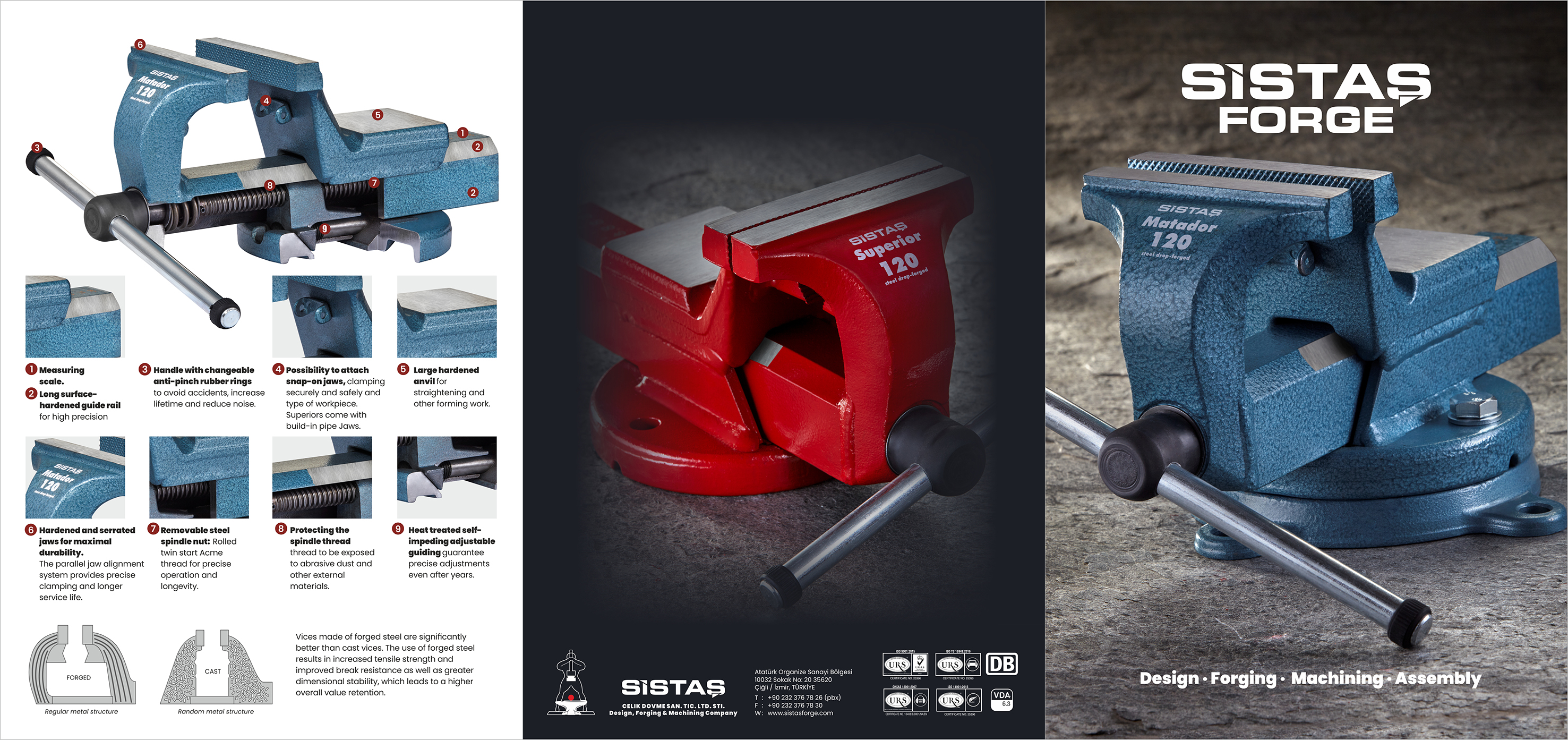 In der Umformtechnik und Schmiedetechnik zählt Qualität: Geschmiedeter Stahl (Dövme Çelik) bietet gegenüber gegossenen Werkzeugen höhere Zugfestigkeit. SISTAS Forge fertigt Schmiedeschraubstöcke seit Jahrzehnten für Werkstätten weltweit – vom Werkbankschraubstock bis zum Rohrschraubstock Superior mit integrierten Rohrklemmen.